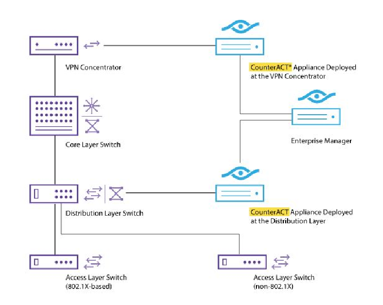 ForeScout CounterACT® is a physical or virtual security solution that dynamically identifies and evaluates network devices and applications the instant they connect to your network. Because CounterACT doesn't require agents, it works with your devices—managed and unmanaged, known and unknown, PC and mobile, embedded and virtual. CounterACT quickly determines the user, owner, operating system, device configuration, software, services, patch state and the presence of security agents. Next, it provides remediation, control and continuous monitoring of these devices as they come and go from the network.